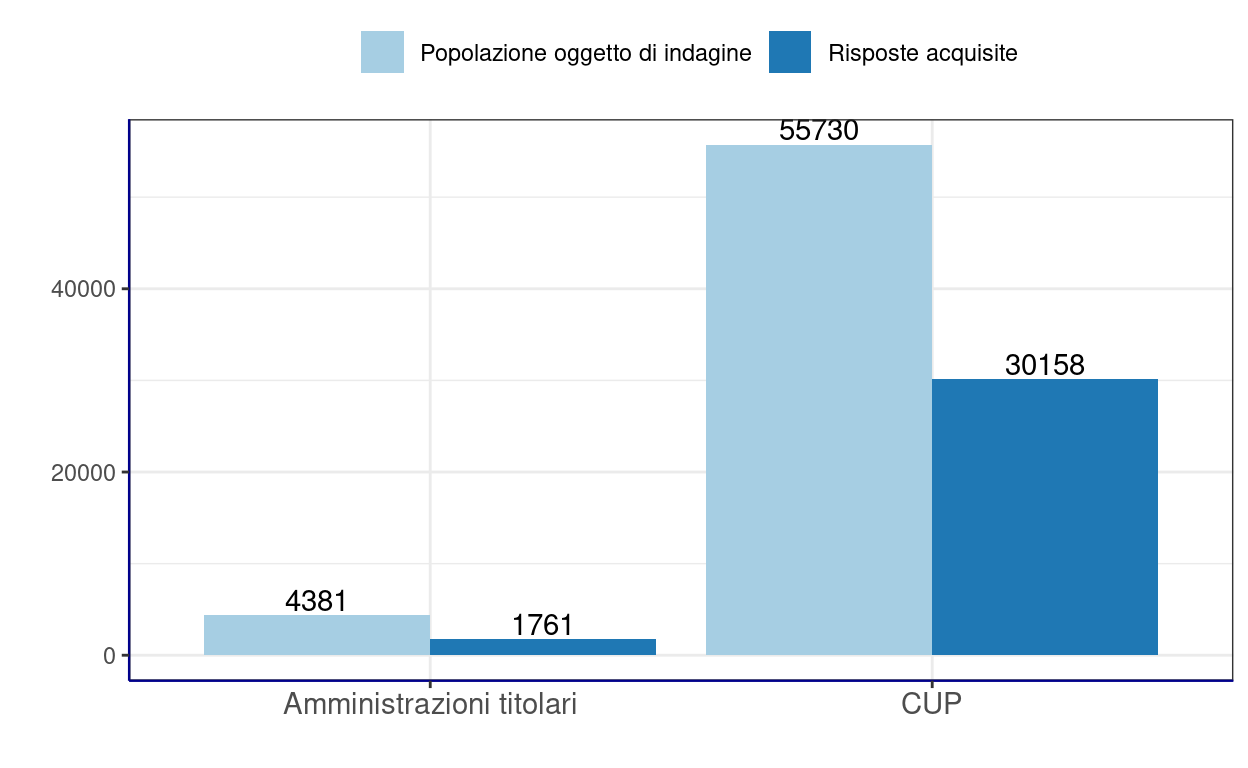 Su un totale di 27.865 CUP sono stati compilati i questionari di ben 15.079 CUP, con una percentuale di risposta pari al 54%, che per la metodologia di rilevazione utilizzata (via web) è ben al di là dei consueti tassi di risposta Si noti che trattandosi del primo anno della rilevazione, il risultato ha evidentemente risentito di una attività di progettazione e organizzazione impegnativa, per cui la risposta si può ritenere un ottimo risultato.