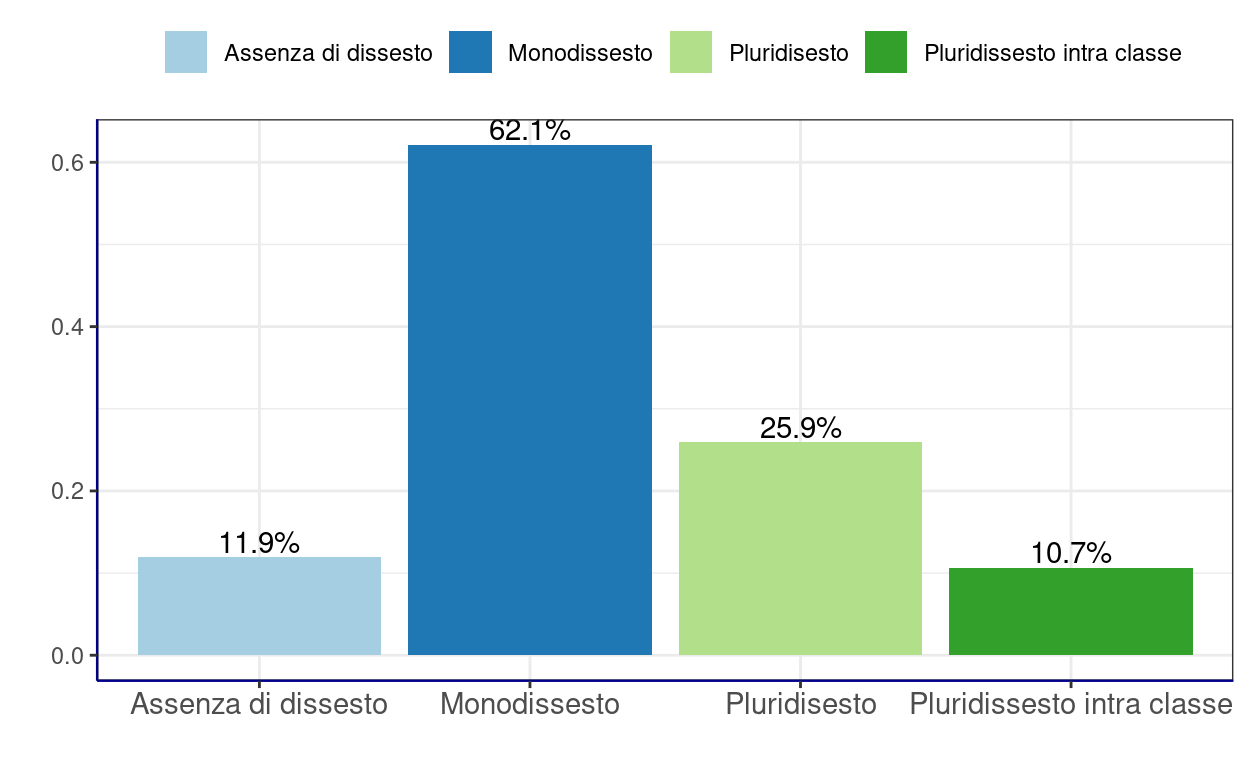 Il 61,6% dei CUP censiti, sono relativi a monodissesti56, il 21,3% a pluridissesti57 intra classi, ovvero sono relativi a più tipologie di dissesti appartenenti alla stessa classe: costiera, idraulica, frane, valanghe, incendi; il 5,2% a pluridissesti tra classi di dissesto diverse e l’11,9% non sono invece riconducibili a dissesti, sebbene di questi ultimi il 67,7% sono realmente non riconducibili a dissesti, mentre il restante 32,3% è rappresentativo di opere definibili come preventive, ovvero realizzate in assenza di dissesti verificatisi.
