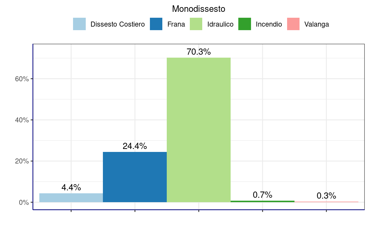 Tra i monodissesti, quasi il 95% dei CUP sono riconducibili al dissesto idraulico (70,3%) e alle frane (24,4%), percentuali nettamente inferiori sono invece relative al dissesto costiero (4,4%), agli incendi (0,7%) e alle valanghe (0,3%).